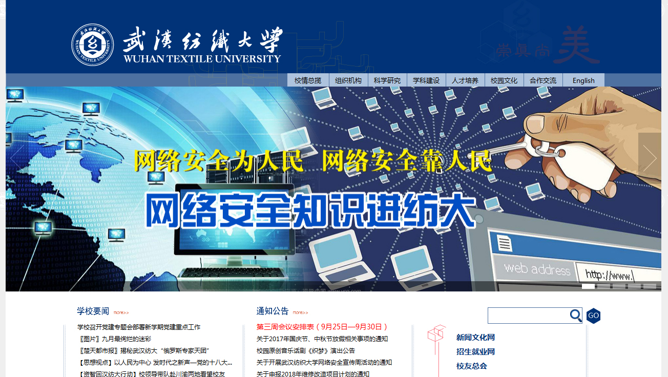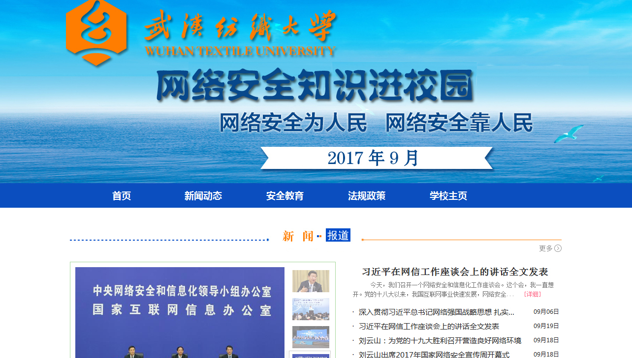 湖北省2017年国家网络安全宣传周重点活动高校有十所,武汉纺织大学是三所入选的省属高校之一,为配合《国家网络安全法》的宣传,我校根据上级要求和学校自身实际,将本校2017年网络安全宣传周的时间定在9月22日至9月28日。