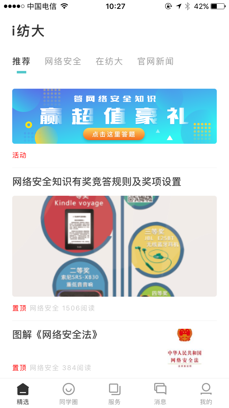 国家网络安全宣传周期间,学校组织全校师生在线观看省教育厅主办的“同上一堂网络安全公开课”节目;信息技术中心举办了网络安全知识有奖竞答,有5000人次在 “i纺大-今日校园”手机APP上参与了网络安全知识答题;信息技术中心为网络安全宣传周制作了专题网站,用于解读《网络安全法》和展示网络安全图片和视频;信息技术中心、党委宣传部、数学与计算机学院联合举办了网络安全知识讲座,邀请了清华大学、知名网络安全企业的网络安全专家为学校师生形象讲解了网络安全知识;在南湖、阳光校区专门设立了宣传广告栏和咨询处。网络安全宣传一系列活动,积极营造氛围,引导师生广泛参与到网络安全宣传教育活动中来,切实提高了师生网络安全意识及网络安全技能。