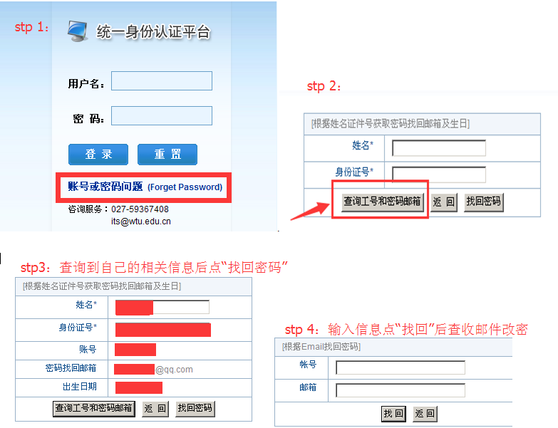 1.办法1:自助找回密码:(注:如果帐号是第一次登录,您会在stp3看到密码提示)