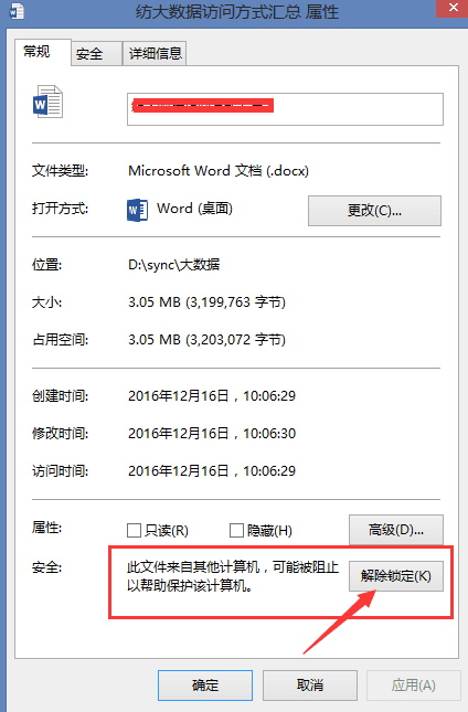 此时关闭文件,右击文件选择属性选择解除锁定,然后再打开就可以了。