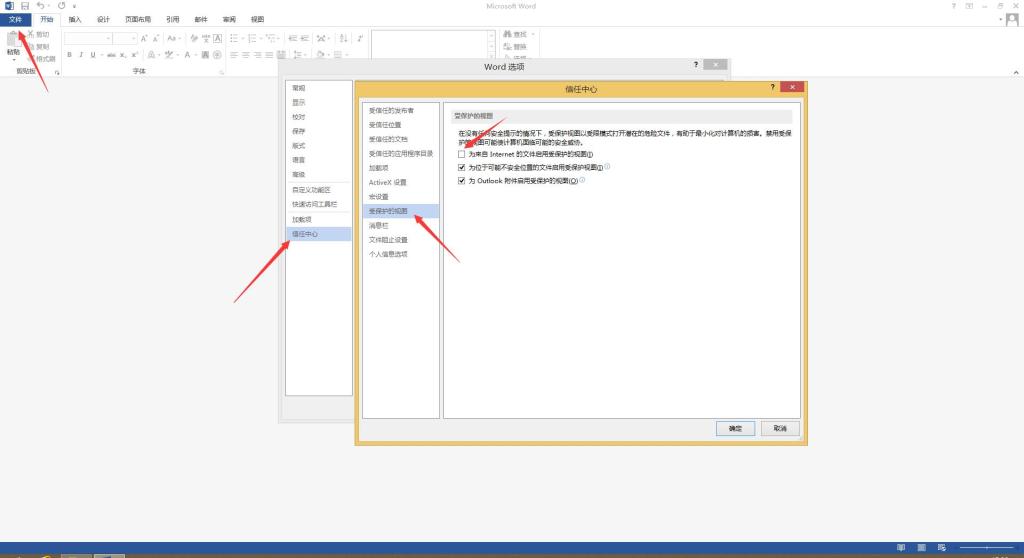 在无法打开office文档界面下,关闭提示,单击“文件”菜单,在对话框左侧找到“信任中心”选项,在弹出的对话框左侧找到“受保护的视图”选项,点击“信任中心设置”,将“为来自Internet的文件启用受保护的视图”勾选取消即可,点击“确定”按钮,再次打开office文档。如图所示: