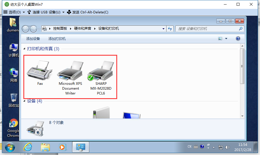 虚拟云桌面在安装配置完成时已配置好共享使用本地打印机和扫描仪服务,用户在虚拟机桌面上对文档进行打印的时候会自动关联到用户所在的本地打印机,如下图所示: