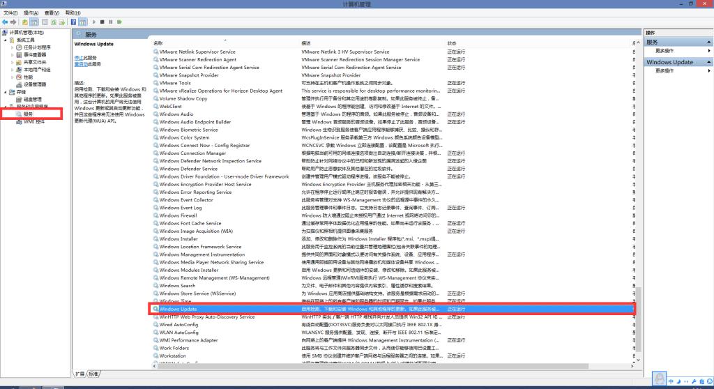 第二步:选择“服务和应用程序”——“服务”,找到“window update”服务,如下图所示