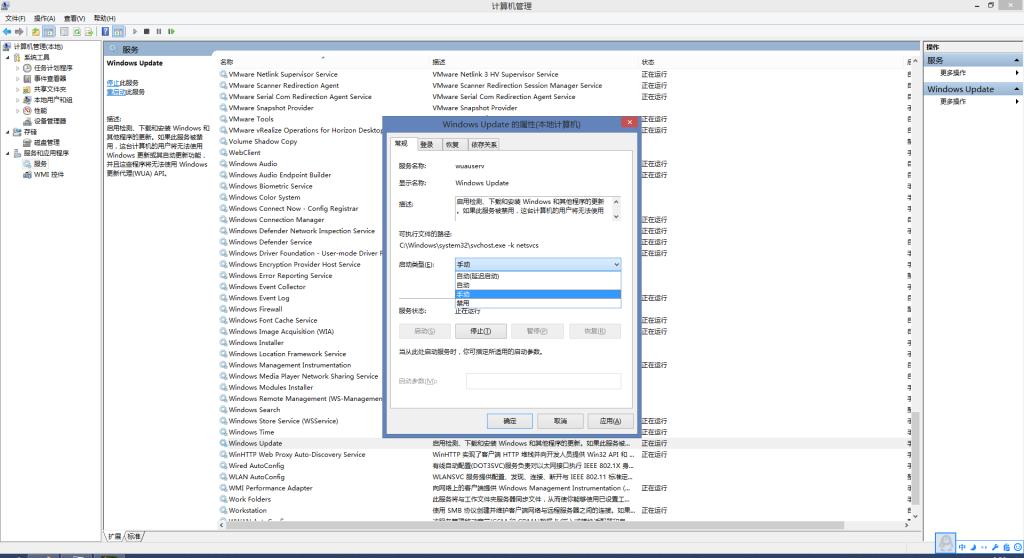 第三步:右键“window update”服务属性,将该服务启动类型设置为“手动”,设置完成后确定。如下图所示